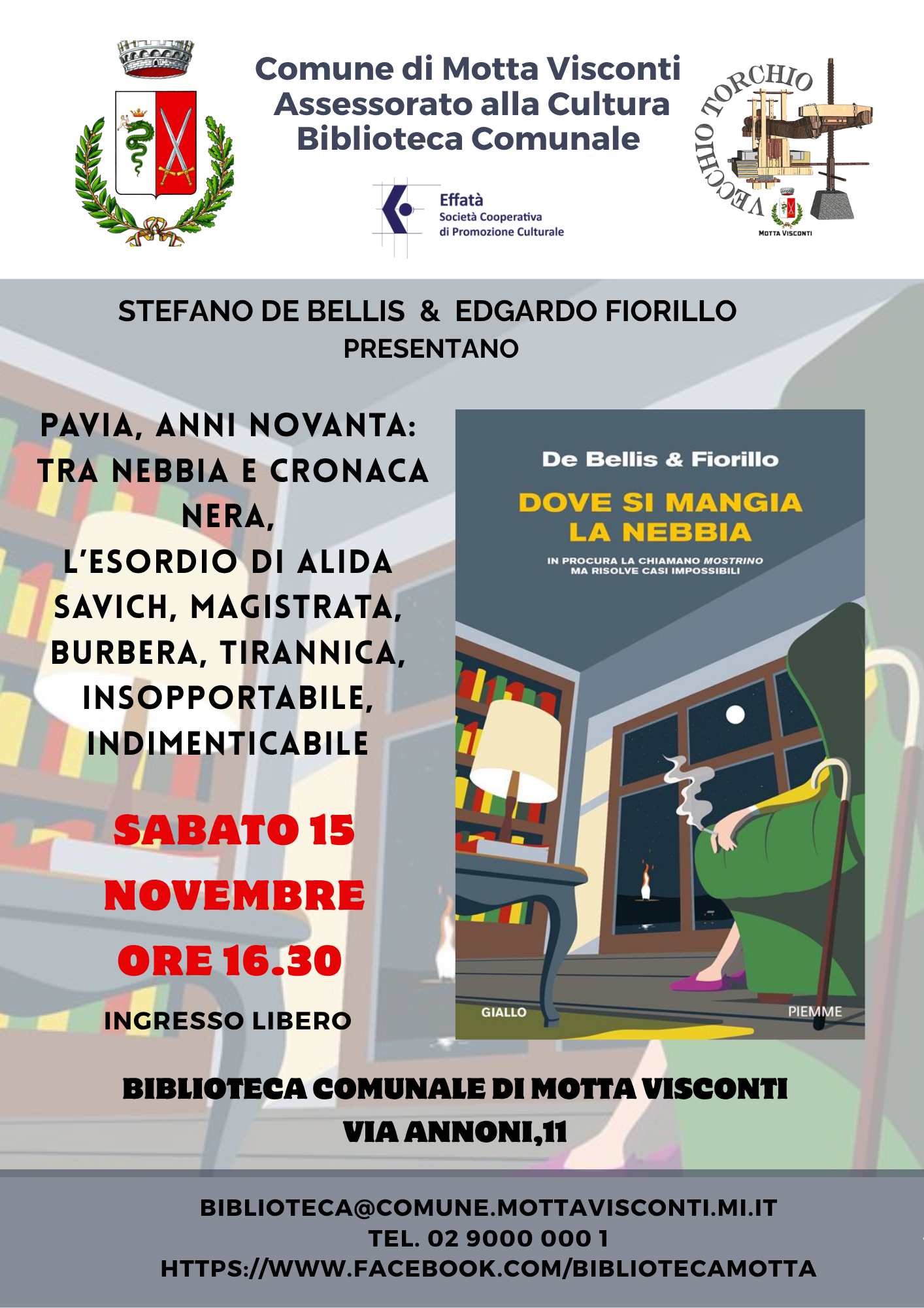 Sabato 15 novembre alle ore 16.30, la Biblioteca comunale ospita la presentazione del libro “Dove si mangia la nebbia”, scritto da De Bellis & Fiorillo.