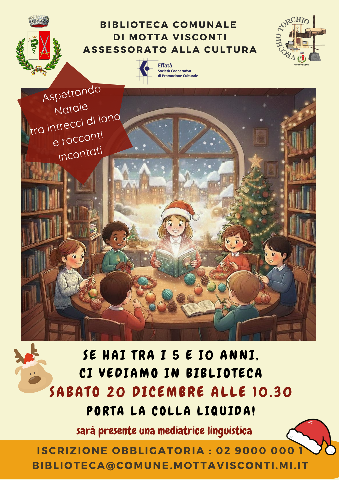 La Biblioteca Comunale organizza un laboratorio natalizio dedicato ai bambini dai 5 ai 10 anni. L’incontro si svolgerà sabato 20 dicembre alle ore 10.30 presso la Biblioteca Comunale di Motta Visconti. Un momento dedicato a letture e attività creative a tema natalizio, tra intrecci di lana e racconti.