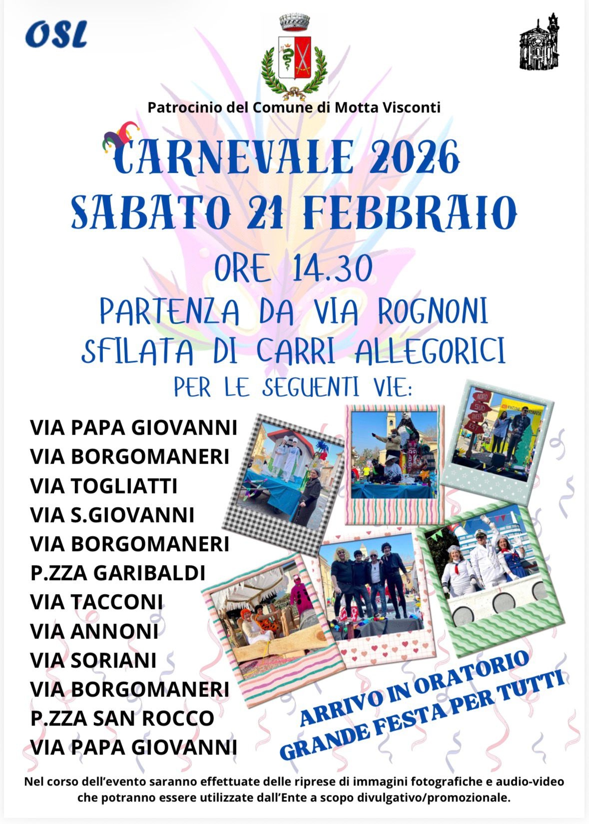 La manifestazione prenderà il via Sabato 21 febbraio 2026 alle ore 14.30, con partenza da Via Rognoni e arrivo in oratorio, dove la festa proseguirà con momenti di animazione e convivialità aperti a tutti.