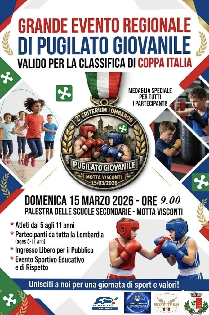 Il Comune di Motta Visconti ospiterà domenica 15 marzo 2026 alle ore 9.00, presso la palestra delle scuole secondarie, il 2° Criterium Lombardo di Pugilato Giovanile, manifestazione sportiva valida per la classifica di Coppa Italia di Pugilato.