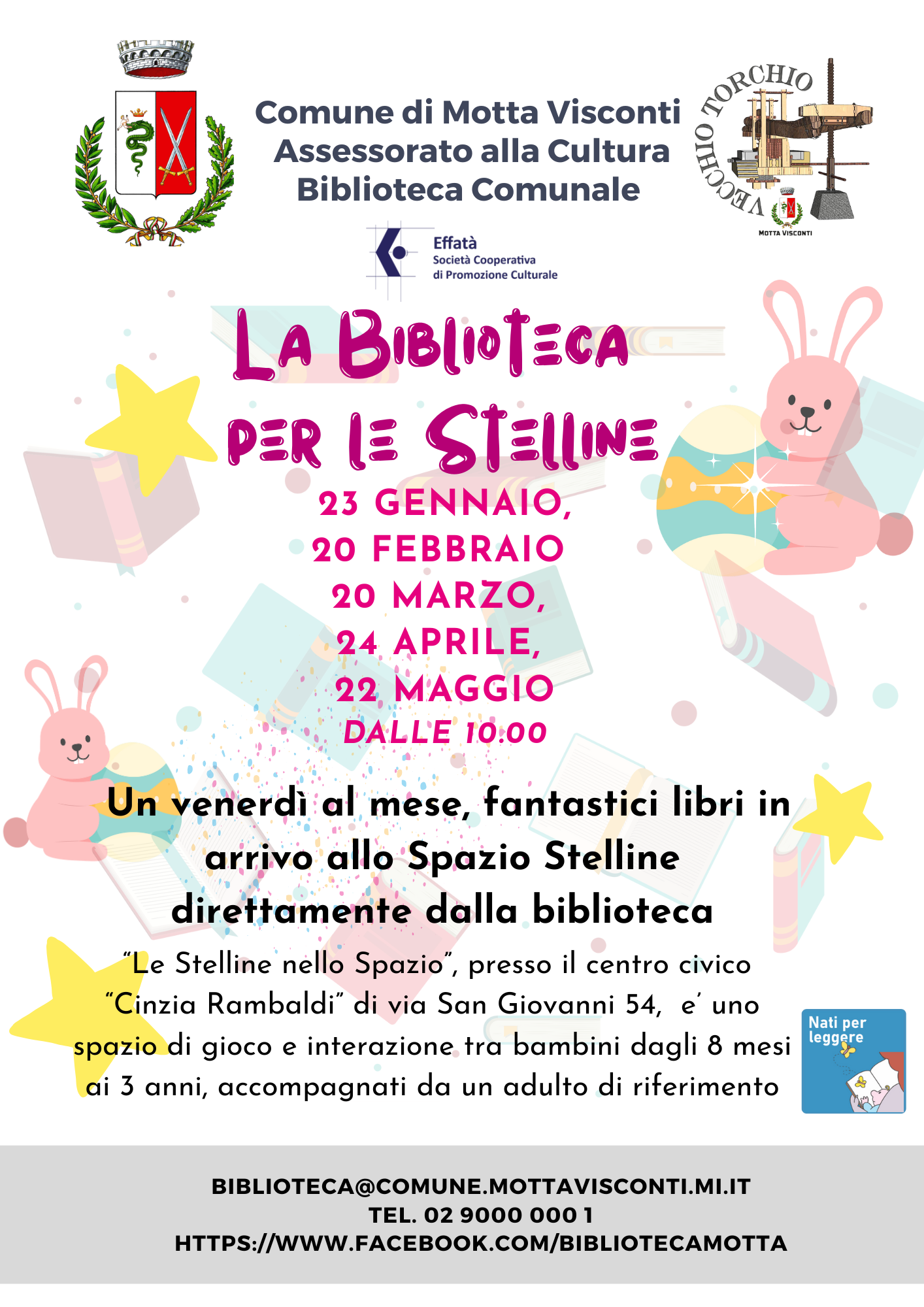 Vi informiamo che gli appuntamenti in Biblioteca per le Stelline si svolgeranno il 23 gennaio, 20 febbraio, 20 marzo, 24 aprile e 22 maggio, alle ore 10.00, offrendo uno spazio di gioco e interazione tra bambini dagli 8 mesi ai 3 anni, accompagnati da un adulto di riferimento, per avvicinarsi al mondo delle storie.